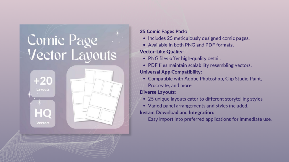 Access 25 detailed comic pages in PNG/PDF formats. Versatile layouts for varied storytelling. Compatible across major apps. Instant download and easy integration for your creative projects.